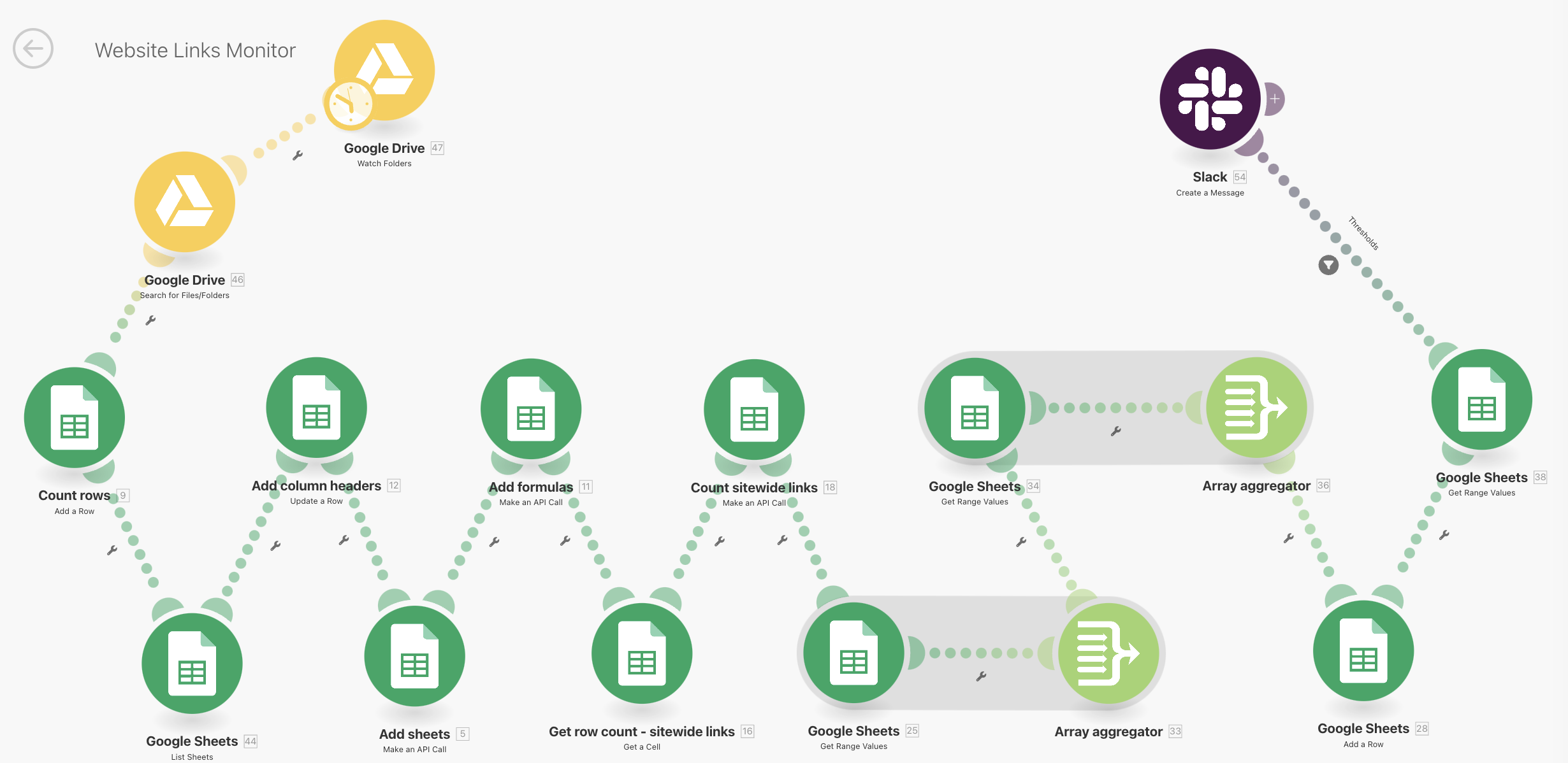 This module extracts data from a set range in the Google Sheet, pulling in all the info needed for comparison, including the categorized totals of broken links.Array Aggregator Modules